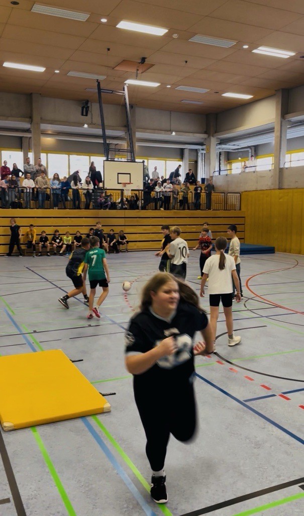 Im der Jahrgangstufe 5 stellte jede Klasse zwei gleich starke Teams, die in der Gruppenphase um den Einzug ins Halbfinale kämpften. Mit viel Übersicht, starkem Laufspiel und cleveren Aktionen setzten sich schließlich vier erfolgreich taktierende Teams durch. In den Halbfinals ging es eng zu, doch Teams aus der 5B und 5D zeigten an diesem Tag das beste Zusammenspiel. Im Finale setzte sich schließlich die 5D durch und holte verdient den Turniersieg.