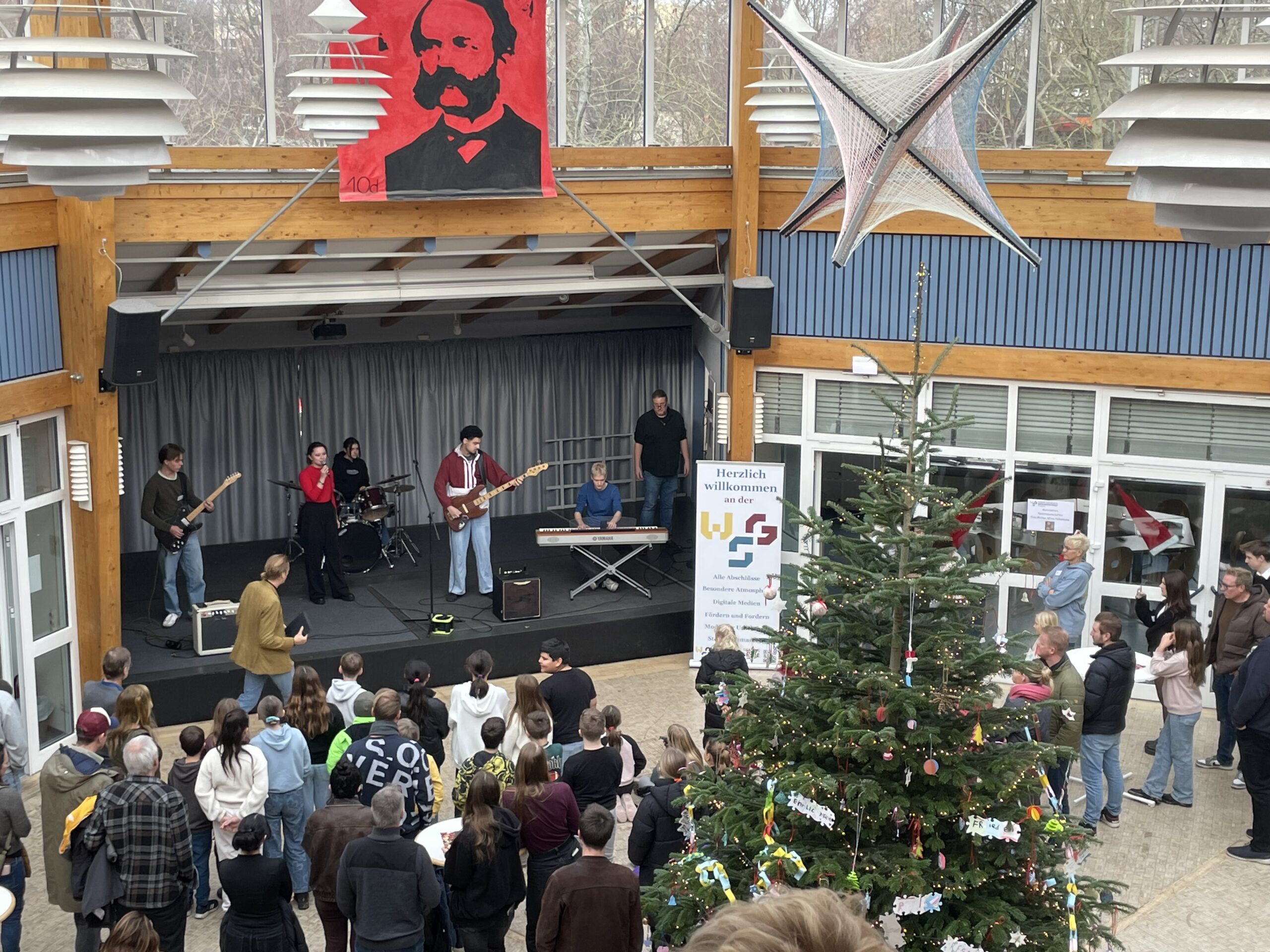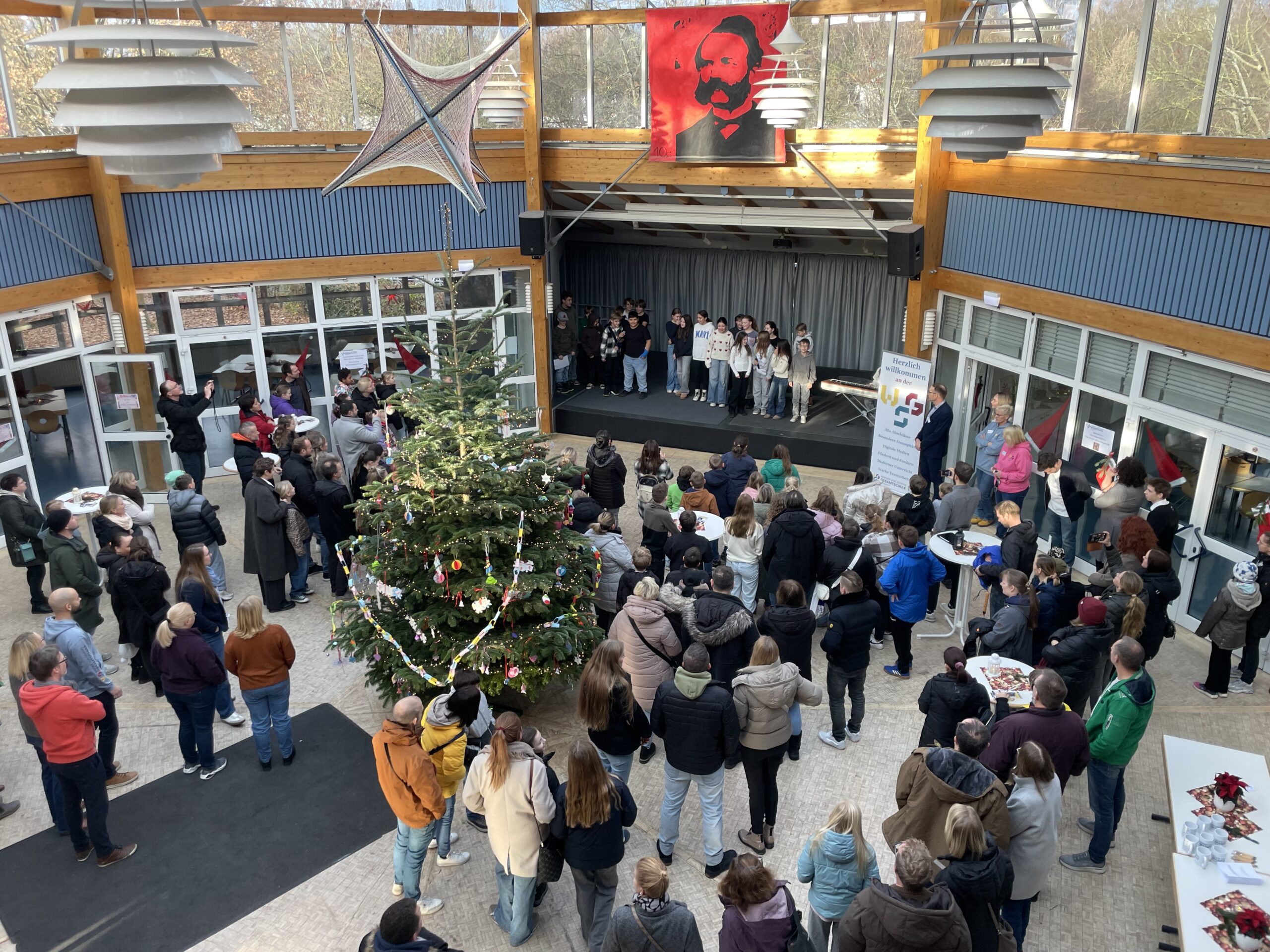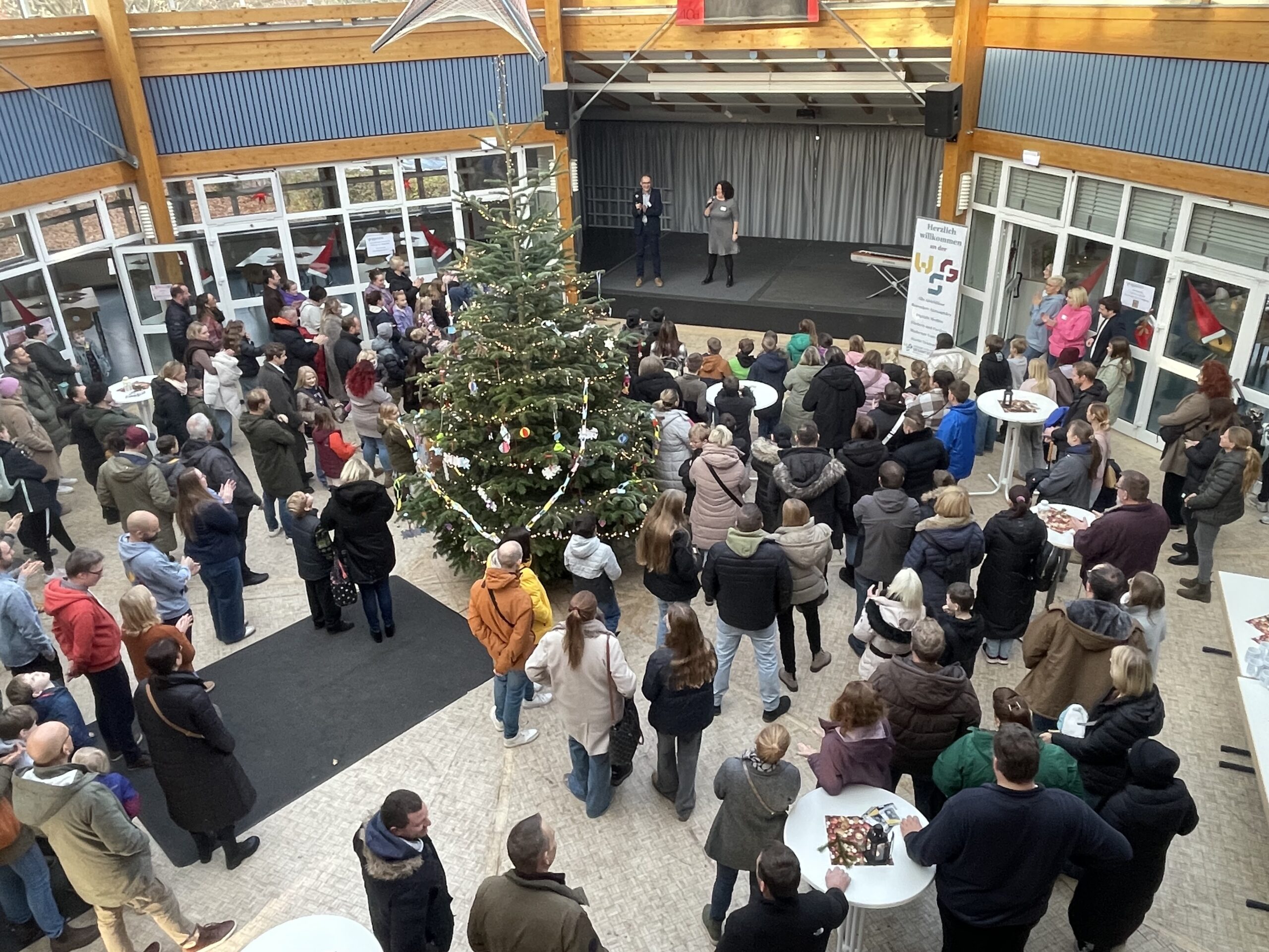 Im Anschluss begrüßte unser Schülersprecher Moritz alle Gäste offiziell und hieß insbesondere die vielen Grundschulkinder und ihre Familien herzlich willkommen. Danach stellte unser Schulleiter, Herr Kloer, das Team der WSG vor, bevor Frau Herzog allen Besucherinnen und Besuchern einen erlebnisreichen Vormittag mit vielen Einblicken, Erfahrungen und Entdeckungen wünschte.