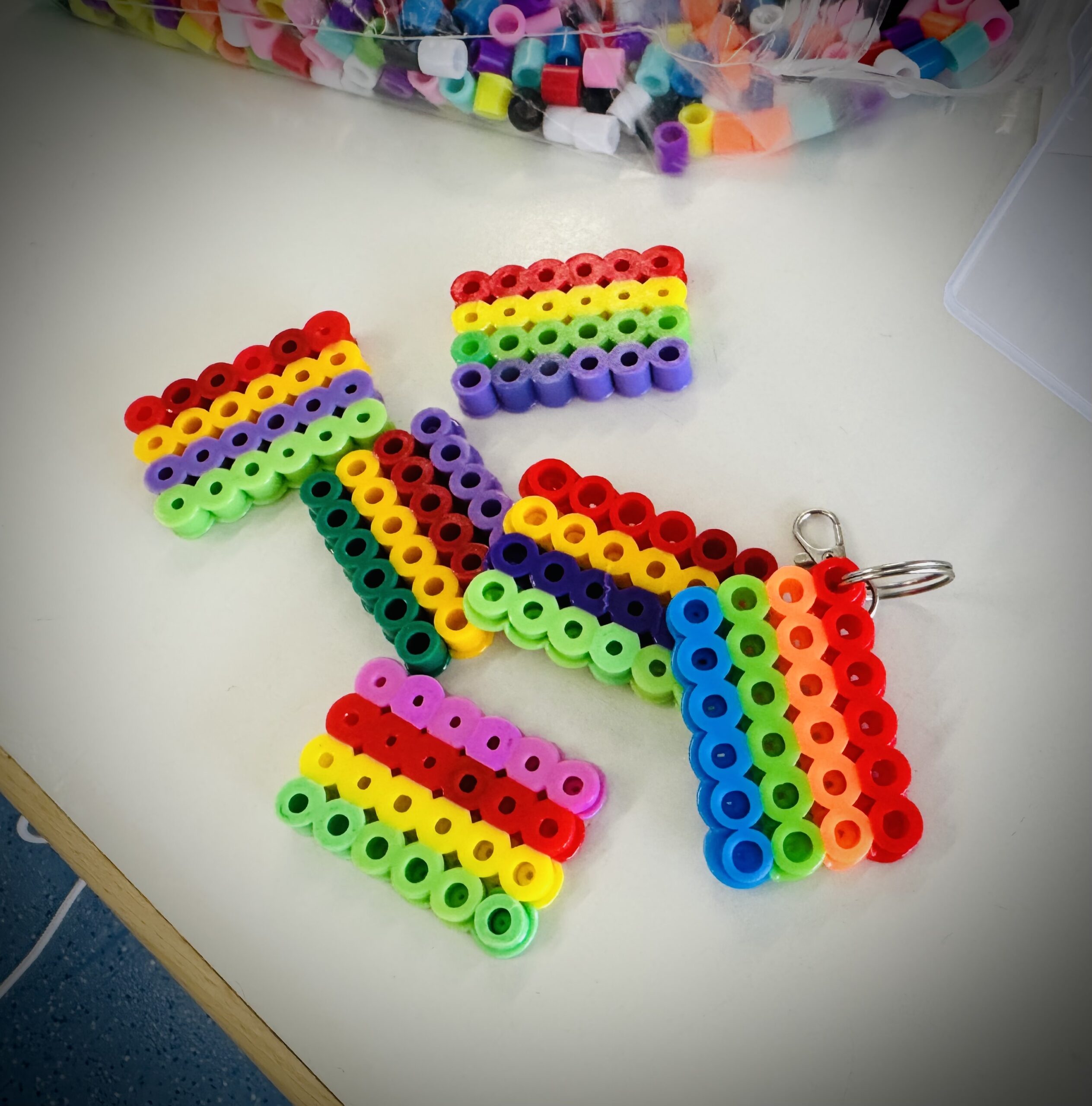 Den Abschluss bildete in der Mittagspause die Aktion HAPPY NEW QUEER im Forum. In Form einer fröhlichen Disco mit Quizfragen zur Bedeutung der Abkürzung LGBTQ+ kamen viele neugierige und gut gelaunte Schüler*innen zusammen. Als kleine Motivation konnten Queer-Souvenirs gewonnen werden, die am Vormittag von den beteiligten Schüler*innen selbst gebastelt worden waren.
